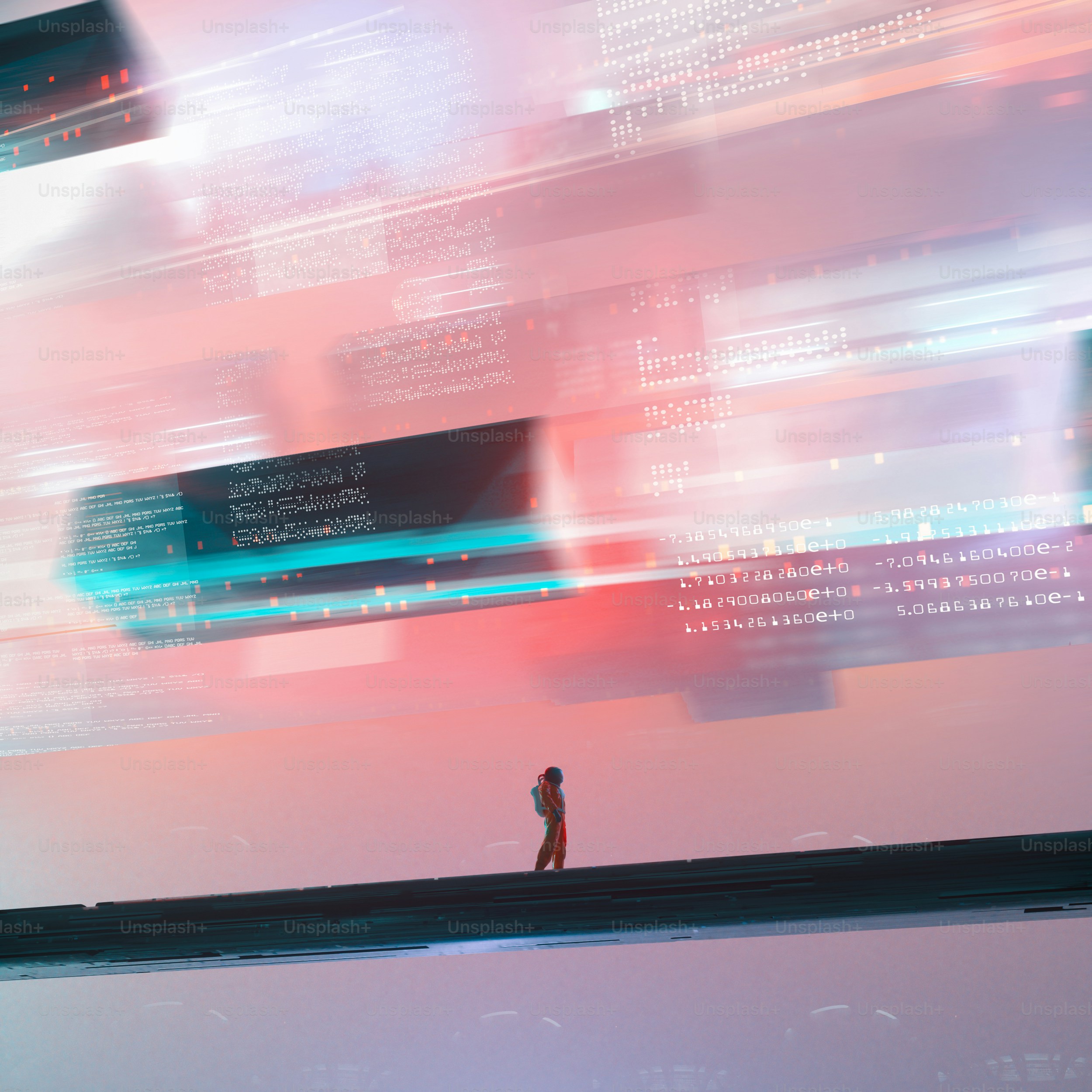 - flickering typographic/code fragments