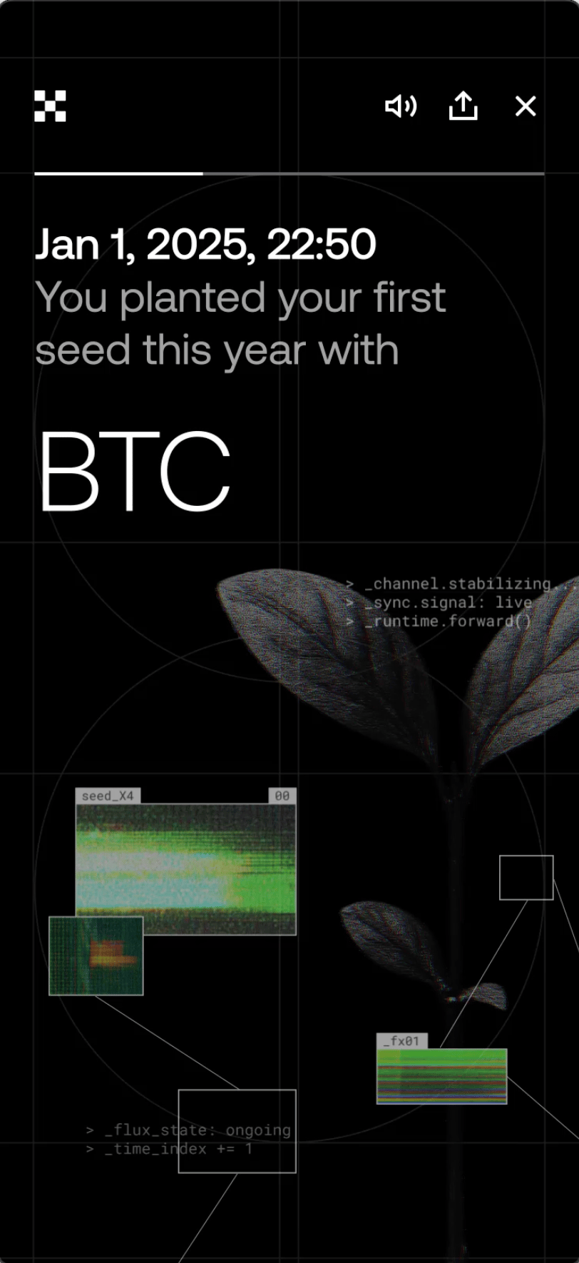 A hybrid language where organic forms (sprouts, flowers, planets, growth cycles) merge with digital overlays (glitch bands, RGB noise, typographic fragments, system schematics). The intent: calm, cinematic, premium—yet alive.