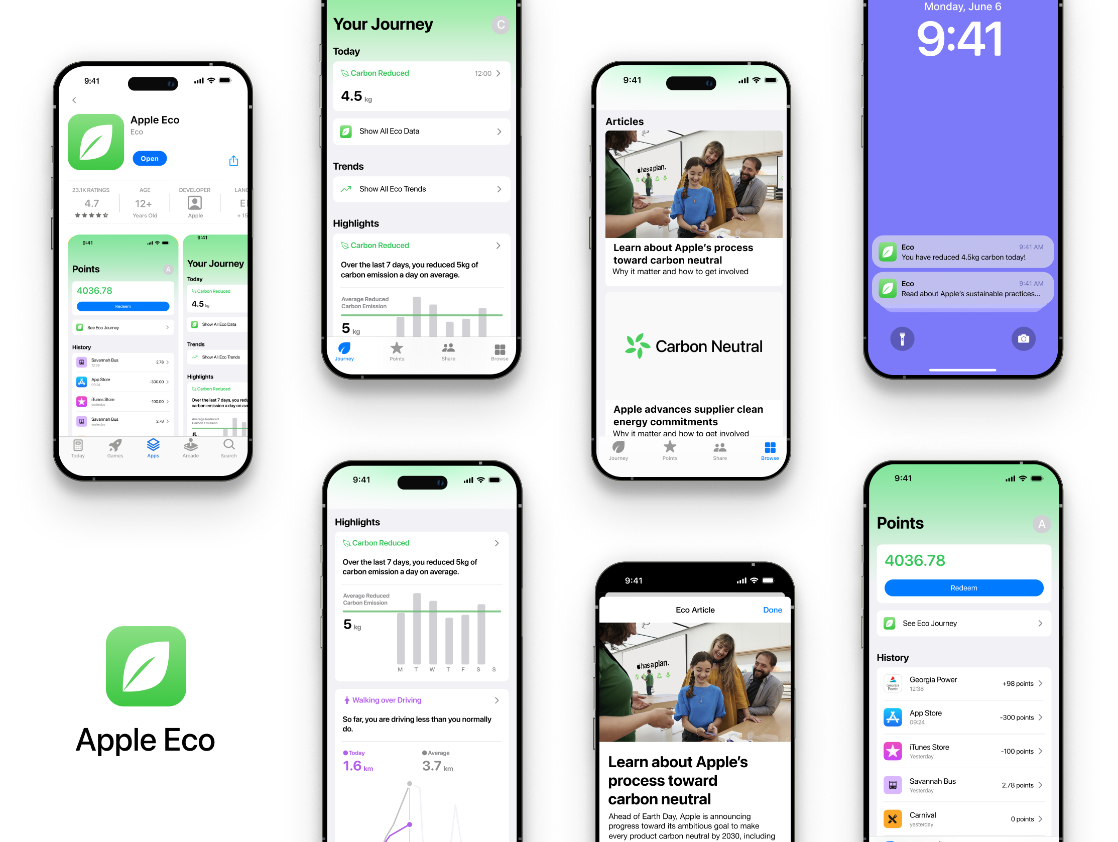 Designed an "Apple Eco" platform, empowering people to track their environmental impact, earn tangible eco points through sustainable purchases to spend on Apple products, and learn about Apple's sustainable process and practices.